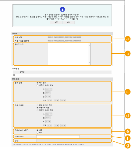 [발표 일정]펌웨어를 즉시 다운로드하려면 [즉시 발표]을 선택하십시오. 지정한 날짜와 시간에 펌웨어를 자동으로 다운로드하려면 [지정한 일시에 발표]을 선택하고 [년:]/[월:]/[일:]/[시각:]에 날짜와 시간을 지정하십시오. 일주일 이내 범위에서 시간을 먼저 예약할 수 있습니다.