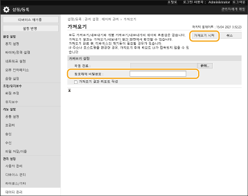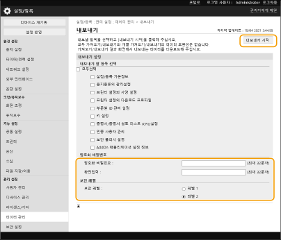 내보내기 한 설정 데이터를 가져오기할 때 [암호화 비밀번호]에 입력한 비밀번호를 입력해야 합니다. 영숫자 문자를 사용하십시오.