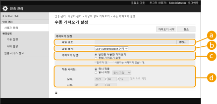 전체 가져오기를 수행할 때 가져온 파일에 열거되지 않은 사용자는 기기에서 삭제됩니다. 하지만 기본적으로 등록되어 있는 "-----"와(과) "Administrator"은(는) 가져온 파일에 열거되어 있지 않더라도 유지됩니다.