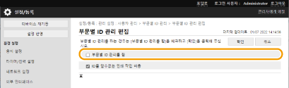 부서 ID를 토대로 사용자를 그룹으로 구성하거나 관리할 수 있습니다. 다음의 절차에 따라 부서 ID 관리를 구성하고, 기기가 인쇄에 사용된 총 페이지 수를 계산하도록 기능을 활성화하십시오.