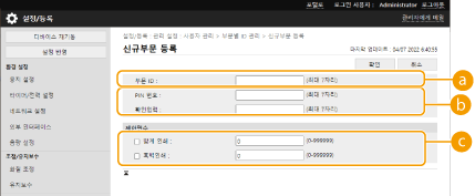 또한 부서 ID 및 PIN의 요구 사항으로 7자리를 입력할 수 있습니다. 자세한 내용은 대리점이나 서비스 담당자에게 문의하십시오.
