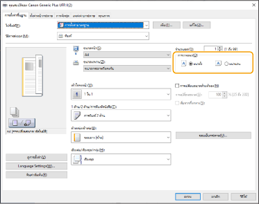 1 | เลือกการวางแนวของต้นฉบับบนหน้าจอการตั้งค่าการพิมพ์ของแอปพลิเคชัน |