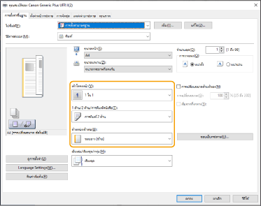 3 | ขณะที่ตรวจสอบตัวอย่างก่อนพิมพ์ ให้ตั้งค่า [เค้าโครงหน้า] [ลำดับหน้า] [1 ด้าน/2 ด้าน/การพิมพ์หนังสือ] [ตำแหน่งเข้าเล่ม] |
