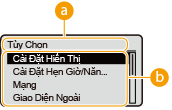 Các mục cài đặt thuộc cấp menu hiện tại được hiển thị theo danh sách.