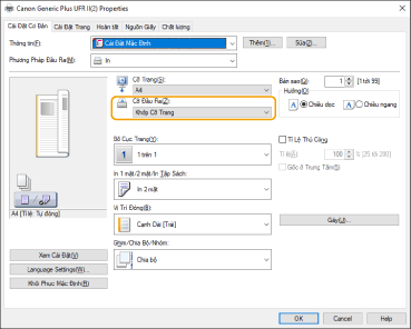 3 | Khi xem trước trang in, cài đặt [Bố Cục Trang] [Thứ Tự Trang] [In 1 mặt/2 mặt/In Tập Sách] [Vị Trí Đóng]. |