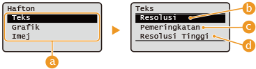 | <Pemeringkatan> Menghasilkan imej bercetak dengan kontras yang jelas. Mod ini sesuai untuk mencetak data imej seperti imej foto. |