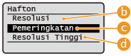 | <Resolusi> Menghasilkan imej bercetak dengan gradasi dan garisan luar yang lebih lancar. Mod ini sesuai untuk mencetak rajah dan graf dengan lancar menggunakan gradasi. |