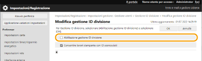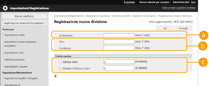 La Gestione ID divisione è valida solamente per gli utenti registrati sul dispositivo locale. Se si effettua l'accesso come utente con privilegi di amministratore gli ID e PIN del Manager di sistema vengono assegnati automaticamente e gestiti come ID divisione. |