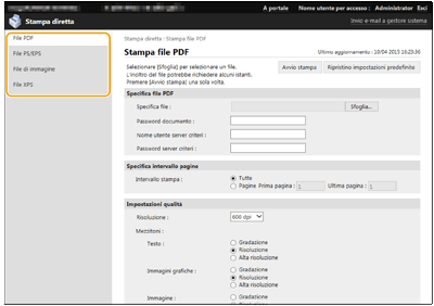 ![]() | Utilizzando la IU remota, è possibile stampare i file salvati su un computer o una rete direttamente dalla macchina senza utilizzare il driver stampante. Per stampare, non è necessario aprire i file nel computer. |