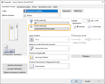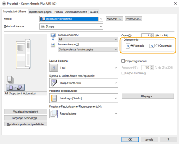 2 | Nella schermata [Impostazioni di base] del driver, impostare [Orientamento] sullo stesso orientamento che è stato impostato nella Fase 1. |