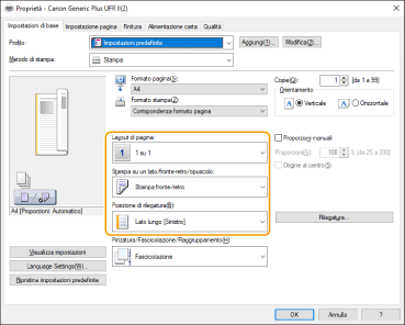 3 | Controllando l'anteprima di stampa, impostare [Layout di pagina] [Ordine delle pagine] [Stampa su un lato/fronte-retro/opuscolo] [Posizione di rilegatura]. |