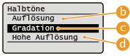 | <Auflösung> Erzeugt gedruckte Bilder mit gleichmäßigerer Abstufung und Konturen. Dieser Modus ist zum gleichmäßigen Drucken von Abbildungen und Diagrammen mithilfe der Gradation geeignet. |