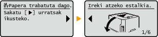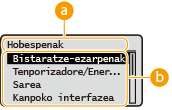 Aldatu egin ditzakezu pantailari dagozkion ezarpenak; adibidez, makina PIZTU ostean berehala zein pantaila agertzen den, eta mezurik agertzen den gelditzen den paper eta tonerrari dagokionez. <Bistaratze-ezarpenak>