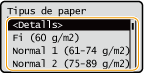 Per verificar les opcions detallades per a un tipus de paper, seleccioneu <Detalls> seleccioneu el tipus de paper que es comprovarà.