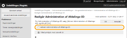 Sørg for, at afdelings-ID'er er blevet indstillet for de brugere, der registreres i maskinen. Registrering af brugerinformationer i den lokale enhed Administration af afdelings-ID er kun gyldigt for brugere, der er registreret på den lokale enhed. Hvis du logger på som en bruger med administratorrettigheder, tildeles der automatisk et Systemadministrator-ID og en Systemadministrator-PIN-kode, og administreres som afdelings-id. |
