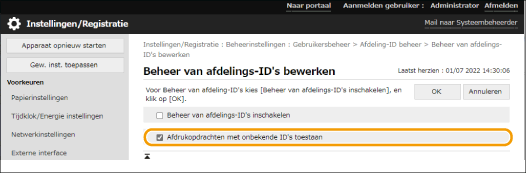 U kunt afdelings-ID-beheer gebruiken voor het beheer van afdrukbewerkingen die via een computer worden uitgevoerd. Gebruik deze functie wanneer u de beveiliging wilt verbeteren of het aantal pagina's dat wordt afgedrukt, wilt controleren.