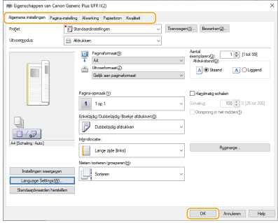 Schakel zo nodig tussen de tabbladen om de gewenste afdrukinstellingen op te geven.