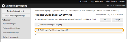 Merk av i denne boksen for å godta utskriftsjobber fra skrivere som ikke støtter Avd. ID styring.
