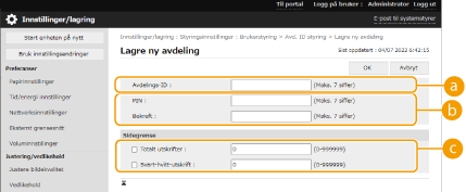 Avdelings-ID-styring er kun gyldig for brukere som er registrerte på den lokale enheten. Hvis du logger deg inn som en bruker med administratorprivilegier, tilordnes en systemstyrer-ID og PIN-kode automatisk og administreres som avdelings-ID. |