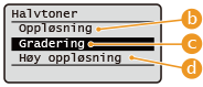 | <Oppløsning> Produserer utskrevne bilder med jevnere gradering og konturer. Denne modusen egner seg til å skrive ut figurer og grafer jevnt ved bruk av gradering. |