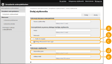 Jeśli nazwa użytkownika jest numeryczna i składa się z siedmiu cyfr lub mniej, ten sam numer jest przypisywany do tego samego użytkownika jako identyfikator wydziału. Jeśli hasło tego samego użytkownika jest zarejestrowane jako numer, który składa się z siedmiu cyfr lub mniej, jest ono również ustawiane jako kod PIN dla tego identyfikatora wydziału.