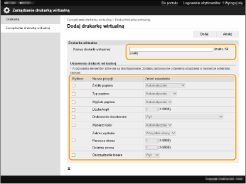 Za pomocą drukarki wirtualnej można korzystać z funkcji drukowania LPD i FTP, stosując wcześniej zarejestrowane jako drukarka wirtualna ustawienia drukowania. Przykładowo, wcześniejsze zarejestrowanie ustawień takich jak typ papieru, liczba kopii i drukowanie dwustronne eliminuje potrzebę konfigurowania tych opcji dla każdego zadania drukowania z osobna.
