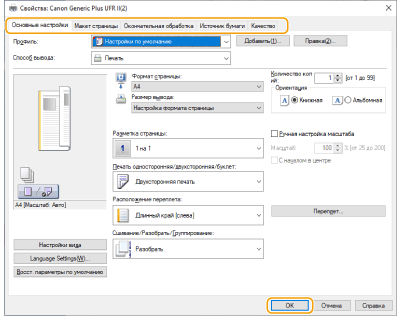 Для настройки требуемых параметров печати воспользуйтесь соответствующими вкладками.