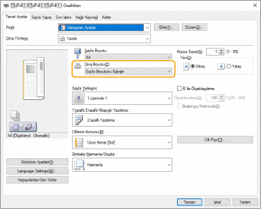Yazıcı sürücüsündeki [Çıkış Boyutu] ile yazdırılacak kağıdın boyutunu eşleştirin.