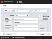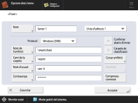 ![]() Demaneu al vostre administrador de xarxa informació sobre el servidor de fitxers. Podeu introduir un màxim de 128 caràcters alfanumèrics per al <Nom de l'amfitrió> al tauler de control. A més, també podeu introduir un màxim de 255 caràcters alfanumèrics per al <Camí de la carpeta>. Especifiqueu les opcions del servidor respectant el límit de caràcters. <Nom de l'amfitrió>Introduïu el nom de l'amfitrió del servidor de fitxers. ![]() Quan se selecciona <Windows (SMB)> Si seleccioneu <Windows (SMB)>, es mostren els botons <Cercar amfitrió> i <Examinar>. Podeu especificar fàcilment un servidor de fitxers cercant o visualitzant la xarxa. <Examinar> només es mostra quan l'opció <1.0> de <Especificar versió del client SMB> està establerta en <On>. Quan seleccioneu <Directori> a la llista desplegable de la pantalla <Examinar>, podeu seleccionar entre els noms de domini del servidor del directori actiu registrat a l'equip. Podeu registrar un màxim de cinc servidors de directoris. Quan seleccioneu <WebDAV> Després d'introduir el nom de l'amfitrió, premeu <Següent>. <Camí de la carpeta>Especifiqueu el directori de la carpeta a la qual s'envien dades. ![]() Quan <Windows (SMB)> se selecciona per al protocol, <Comproveu connexió> només pot comprovar fins al primer nivell del camí de la carpeta especificada. <Nom d'usuari>Introduïu el nom d'usuari d'inici de sessió del servidor de fitxers. <Contrasenya>Introduïu la contrasenya d'inici de sessió del servidor de fitxers. ![]() Si especifiqueu la destinació per a la qual heu activat <Confirmar abans d'enviar> com a destinació de reenviament, no apareixerà la pantalla per introduir la contrasenya. S'utilitza la contrasenya desada i es porta a terme el reenviament. <Carpeta de classificació>Si <Carpeta de classificació> està activat, quan llegiu i envieu un document, podeu crear una carpeta nova a la carpeta de destinació especificada a <Camí de la carpeta> i desar el document llegit a la carpeta nova. Creació d'una altra carpeta en una carpeta de destinació abans de la lectura | ||||||||||||