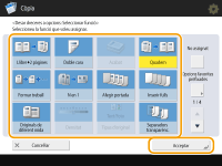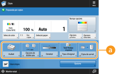 El nombre d'elements de configuració que hi ha a la pantalla de funcions bàsiques i la ubicació on apareixeran són diferents segons les funcions. El botó de drecera no es mostra si s'estableix <No assignat> com a drecera. Els límits de dreceres per a <Opcions> que es poden desar són els següents. Còpia (bàsica): 5 Còpia (ràpida): 6 Llegir i enviar: 2 Si heu canviat la pantalla de funcions bàsiques per a la pantalla Còpia ràpida (Canvi ràpid de la configuració (Pantalla de còpia ràpida)), seleccioneu el botó del pas 3 i premeu <Desar>. |