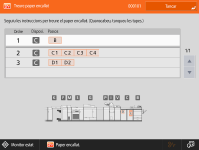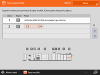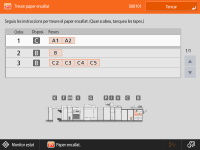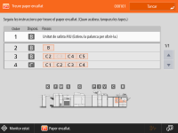 Les taules següents mostren les pantalles típiques d'encallaments de paper i les seves ubicacions (imatge) quan s'utilitzen fulls de 1.300 mm de longitud, així com les referències als procediments corresponents. Les ubicacions dels encallaments de paper poden variar lleugerament a causa de raons com la longitud del paper i el moment en què es produeix l'encallament de paper. |
