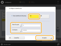 Per utilitzar la funció d'autenticació del servidor proxy, premeu aquesta opció i configureu la informació d'autenticació. A la pantalla que apareix, premeu <On>, introduïu el nom d'usuari i la contrasenya que cal utilitzar per a l'autenticació del proxy i premeu <Bé>.