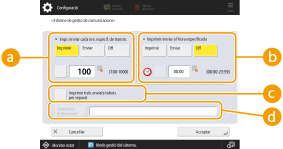 No podeu configurar els paràmetres de l'Informe de gestió de comunicacions mentre <Mostrar registre de treballs> a <Opcions de gestió> està establert en <Off>. A més, si canvieu <Mostrar registre de treballs> a <Opcions de gestió> de <Off> a <On>, <Impr./enviar cada nre. especif. de transm.> i <Imprimir/enviar a l'hora especificada> a l'Informe de gestió de comunicacions canvia automàticament a <Off>. <Mostrar registre de treballs> |