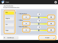 <Ajust fi de densitat>Seleccioneu un color i ajusteu-ne el nivell de densitat segons l'àrea de densitat amb els botons <-> o <+>. Un cop finalitzat l'ajust, premeu <Bé>.