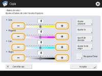 Podeu desar fins a quatre opcions després de l'ajustament. Un cop ajustat el color, premeu <Recuperar/Desar>  seleccioneu un botó de <C1> a <C4>  premeu <Desar>  <Sí>  <Bé>. |