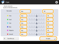per a <Tots colors>. Per establir cada color per separat, utilitzeu els botons de l'esquerra i la dreta per a cada color. Un cop finalitzat l'ajust, premeu <Bé>.