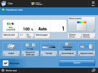 Mostra l'estat de l'opció, com l'escala de còpia, la mida de paper, el nombre de còpies, etc. Assegureu-vos de confirmar les opcions aquí perquè les còpies es facin correctament. Per modificar les opcions, premeu el botó que hi ha a sota de la secció de la pantalla.