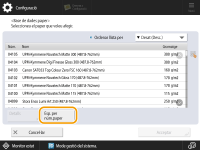 Podeu utilitzar la llista desplegable Ordenar llista per ordenar la llista per data de desament, nom o gramatge, en ordre ascendent o descendent. Es pot visualitzar informació detallada sobre el paper seleccionat prement <Detalls>. Podeu canviar les pàgines prement [  ]/[  ] per seleccionar i desar tipus de paper que es mostren en altres pàgines. |