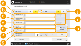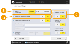 2 | Especifiqueu cada element. ![]() <Mètode autentic. POP>Establiu els mètodes d'autenticació del servidor POP3. Per codificar la contrasenya durant l'autenticació, seleccioneu <APOP>. Per autenticar usuaris en rebre correu (POP), seleccioneu <POP AUTH>. <Autenticació POP abans d'enviar>Per portar a terme l'autenticació utilitzant el servidor POP3, premeu <On>. <Permetre TLS (POP)>Per codificar la comunicació dirigida a i procedent del servidor POP3 utilitzant TLS, premeu <On>. Quan està establerta l'opció <On>, podeu confirmar el certificat de servidor TLS durant la comunicació amb el servidor i afegir CN als elements de verificació. <Confirmar certificat de TLS per rec. POP> |