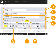 2 | Introduïu la informació necessària. ![]() <Nom de servidor>Introduïu un nom per al servidor LDAP. <Adreça de servidor>Introduïu l'adreça IP o el nom d'amfitrió del servidor LDAP utilitzant caràcters alfanumèrics (Exemple: "ldap.exemple.com"). ![]() <Adreça de servidor> i DNS Per evitar errors, pareu atenció a les qüestions següents quan es porti a terme una cerca de destinacions de l'equip al servidor LDAP. Quan introduïu l'adreça IP, comproveu si el servidor DNS que es pot utilitzar només admet la cerca directa. Quan el servidor DNS només admeti la cerca directa, premeu <No usar> o <Usar> a <Informació d'autenticació> al pas 4. Si seleccioneu <Usar (autent. de seguretat)>, confirmeu que el servidor DNS admeti la cerca inversa. <Ubicació per iniciar cerca>Especifiqueu on ha de començar la cerca a l'arbre de directoris del servidor LDAP. Per a LDAPv3, podeu ometre aquesta opció perquè l'equip recupera automàticament la configuració del servidor. Per a LDAPv2, heu d'especificar sempre el punt. ![]() Introducció del format de <Ubicació per iniciar cerca> Si utilitzeu Windows Server, introduïu el nom de domini d'Active Directory en unitats de cadenes dividides per un punt ("."). Afegiu "DC=" per a cada unitat i separeu-les amb comes ",". Exemple: Si el nom del domini és "joan.exemple.com", introduïu "DC=joan,DC=exemple,DC=com". Si utilitzeu Lotus Notes Domino, introduïu el nom d'identificació del node de l'arbre de directoris (dn) com a continuació: "cn=user1,ou=team1,ou=salesdept,o=canon". <Usar TLS>Per codificar la comunicació dirigida a i procedent del servidor LDAP utilitzant TLS, premeu <On>. <Temps per a cerca>Especifiqueu en segons durant quant temps pot continuar la cerca. <Nombre màx. adr. cerca>Especifiqueu quantes destinacions es poden cercar. <Número de port>Introduïu el número de port utilitzat per a la comunicació dirigida a i procedent del servidor LDAP. |