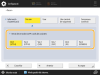 2 | Introduïu el nom d'usuari i la contrasenya i configureu les opcions necessàries. ![]() <Nom d'usuari>Introduïu el nom d'usuari de l'equip desat al servidor LDAP. ![]() Introducció del format del nom d'usuari Si utilitzeu Windows Server introduïu el format "(nom de domini de Windows)\(nom d'usuari de Windows)". Exemple: Si el nom de domini de Windows és "exemple" i el nom d'usuari de Windows és "usuari1", introduïu "exemple\usuari1". Si utilitzeu Lotus Notes Domino, introduïu el nom d'identificació de l'usuari autenticat (dn) com a continuació: "cn=user1,ou=team1,ou=salesdept,o=canon". <Contrasenya>Introduïu la contrasenya desada al servidor LDAP. Quan s'introdueixi la contrasenya, apareixerà <Confirmar> per confirmar-la. Torneu a introduir la contrasenya. <Mostrar pantalla d'autenticació en cercar>Quan cerqueu destinacions, per visualitzar la pantalla d'introducció del nom d'usuari i la contrasenya, premeu <On>. <Versió de servidor LDAP i codis de caràcters>Seleccioneu una combinació de la versió d'LDAP del servidor i el codi de caràcters. |