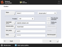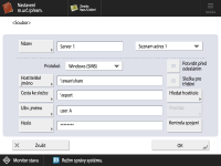 ![]() Informace o souborovém serveru získáte u svého správce sítě. Pro <Hostitelské jméno> lze na ovládacím panelu zadat až 128 alfanumerických znaků. Pro <Cesta ke složce> lze zadat až 255 alfanumerických znaků. Zadejte nastavení serveru v rámci limitu znaků. <Hostitelské jméno>Zadejte hostitelské jméno souborového serveru. ![]() Když je vybrána možnost <Windows (SMB)> Vyberete-li <Windows (SMB)>, zobrazí se tlačítka <Hledat hostitele> a <Procházet>. Souborový server můžete snadno zadat hledáním nebo prohlížením sítě. Možnost <Procházet> je dostupná, pouze pokud je položka <1.0> v <Zadat verzi SMB klienta> nastavena na <Zap>. Pokud v rozevíracím seznamu na obrazovce <Procházet> vyberete možnost <Adresář>, můžete si vybrat z názvů domén serveru služby Active Directory uložených ve stroji. Můžete uložit až pět adresářových serverů. Pokud je vybrána možnost <WebDAV> Po zadání názvu hostitele stiskněte <Další>. <Cesta ke složce>Zadejte adresář složky, do které jsou odeslána data. ![]() Když pro protokol vyberete možnost <Windows (SMB)>, funkce <Kontrola spojení> může pouze zkontrolovat první úroveň zadané cesty ke složce. <Uživatelské jméno>Zadejte uživatelské jméno pro přihlášení souborového serveru. <Heslo>Zadejte heslo pro přihlášení souborového serveru. ![]() Zadáte-li místo určení, pro které aktivujete <Potvrdit před odesláním> jako místo určení pro přesměrování, obrazovka pro zadání hesla se nezobrazí. Použije se uložené heslo a provede se přesměrování. <Složka pro třídění>Pokud je povolena možnost <Složka pro třídění>, můžete při skenování a odesílání dokumentu vytvořit novou složku v cílové složce zadané v poli <Cesta ke složce> a naskenovaný dokument uložit do této nové složky. Vytvoření další složky v cílové složce před skenováním | ||||||||||||