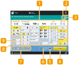 Zde se zobrazuje stav nastavení, např. poměr kopírování, velikost papíru, počet kopií atd. V zájmu správného zhotovení kopií nastavení zde vždy zkontrolujte. Chcete-li nastavení změnit, stiskněte tlačítko pod zobrazením.