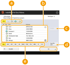 2 | Vælg de modtagere, du vil registrere i en gruppe, og tryk på <OK>. ![]() Modtagertype-knapVælg (e-mail), (I-fax) eller (fil) for at filtrere de modtagere, der vises i adresselisten ( ). Tryk på <Alle> for at vise alle registrerede modtagere. ModtagerModtagere, der er registreret i adresselisten, du valgte i trin 6, vises. Vælg på denne liste de modtagere, du vil registrere i en gruppe. ![]() Når modtagere administreres med adgangsnumre, vises de ikke i listen, hvis du ikke indtaster adgangsnummeret (Begrænsning af adgang til modtagere, der er registreret i adressebogen), når du har trykket på <Adgangsnummer>. <Detaljer/Redigér>Vælg en modtager, og tryk på <Detaljer/Redigér>, hvis du vil tjekke indstillingerne for modtageren. Tryk på <OK> for at vende tilbage til det forrige skærmbillede. <Søg efter navn>Angiv destinationsnavnet. Tryk igen på <Søg efter navn> for at vende tilbage til det forrige skærmbillede. Første bogstav-knapVælg den alfanumeriske knap for det første tegn i modtagernavnet. Tryk på <Alle> for at vise alle registrerede modtagere. |