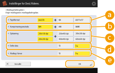 <Papirformat>Angiv det papirformat, som modtageren kan modtage. Angiv denne indstilling, når du har kontrolleret, om papirformatet for de data, der skal sendes, matcher specifikationerne for modtagerens enhed. <A4/LTR>: Sender med A4-/LTR-formatet. <A4/LTR> + <B4>: Sender med A4-/LTR-formatet eller B4-formatet. <A4/LTR> + <A3/11x17>: Sender med A4-/LTR-formatet eller A3-/11" x 17"-formatet. <A4/LTR> + <B4> + <A3/11x17>: Sender med A4-/LTR-formatet, B4-formatet eller A3-/11" x 17"-formatet. ![]() Hvis papirformatet for de scannede data er mindre de formater, der er indstillet i <Papirformat>, sendes dataene med det mindste papirformat, der er indstillet i <Papirformat>, med tomme margener. Hvis papirformatet for de scannede data er større de formater, der er indstillet i <Papirformat>, reduceres dataene og sendes med det største papirformat, der er indstillet i <Papirformat>. Angiv modtagerbetingelserne i henhold til specifikationerne på modtagerens maskine. Hvis papirformatet for de data, der skal sendes, er større end de papirformater, der kan bruges sammen med modtagerens enhed, kan billedet blive klippet eller afskåret. <Komprimeringsmetode>Angiv komprimeringsmetode. Komprimeringsforholdet er højest for MMR, efterfulgt af MR og derefter MH. Jo højere komprimeringshastigheden, jo kortere bliver afsendelsestiden. <Opløsning>Vælg en højere værdi for at forøge opløsningen og billedkvaliteten. Jo højere opløsning, jo længere bliver den nødvendige afsendelsestid. <Delte data>Hvis størrelsen på de data, der sendes, overstiger maksimumsgrænsen (<Største datamængde til afs.>), skal du vælge, om du vil opdele dataene efter størrelse eller pr. side. Hvis du vælger <Til>, opdeles dataene i mindre størrelser, der ikke overstiger grænsen, og afsendes i flere omgange. Modtagerens enhed skal kunne samle de modtagne data. Hvis du vælger <Fra> i <Send via server> ( ) i trin 1 om konfiguration af I-faxindstillingen, afsendes dataene uden at blive opdelt, også hvis de overskrider maksimumsgrænsen. <Modtag i farver>Gør det muligt at sende i farver, hvis destinationsmaskinen understøtter farver. Tryk på <Til> <Næste>, og indstil format og opløsning for papir.![]() Angiv modtagerbetingelserne i henhold til specifikationerne på modtagerens maskine. Der kan opstå en fejl i afsendelsen, hvis du angiver betingelser, som modtagerens maskine ikke understøtter. |