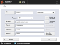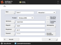 ![]() Spørg din netværksadministrator om flere informationer om filserveren. Der kan maksimalt indtastes 128 alfanumeriske tegn for <Værtsnavn> på betjeningspanelet. Og der kan maksimalt indtastes 255 alfanumeriske tegn for <Mappesti>. Angiv serverindstillingerne inden for tegngrænsen. <Værtsnavn>Indtast hostnavnet for filserveren. ![]() Når <Windows (SMB)> er valgt Hvis du vælger <Windows (SMB)>, vises knapperne <Værtssøgning> og <Browse>. Du kan nemt angive en filserver ved at søge på eller vise netværket. <Browse> er kun tilgængelig, når <1,0> i <Angiv SMB-klientversion> er indstillet til <Til>. Når du vælger <Bibliotek> i rullelisten på skærmen <Browse>, kan du vælge blandt de domænenavne på Active Directory-serveren, der er registreret på maskinen. Du kan registrere op til fem Directory-servere. Når <WebDAV> er valgt Tryk på <Næste>, når værtsnavnet er angivet. <Mappesti>Angiv mappens bibliotek, som dataene sendes til. ![]() Når <Windows (SMB)> er valgt for protokollen, kan <Kontrollér forbindelsen> kun kontrollere op til det første niveau af den specificerede mappesti. <Brugernavn>Indtast filserverens login-brugernavn. <Password>Indtast filserverens login-password. ![]() Hvis du angiver modtageren, for hvilken du aktiverer <Bekræft før afsendelse> som videresendelsesmodtageren, vises skærmbilledet til indtastning af password ikke. Det registrerede password anvendes, og der sker en videresendelse. <Sorteringsmappe>Hvis <Sorteringsmappe> er aktiveret, når du scanner og sender et dokument, kan du oprette en ny mappe i destinationsmappen, der er angivet i <Mappesti>, og gemme det scannede dokument i den nye mappe. Oprettelse af en ny destinationsmappe inden scanning | ||||||||||||