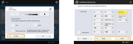 Endvidere vises knapper, som f.eks. <Annullér>, der annullerer indstillingen og vender tilbage til det forrige skærmbillede, <Næste>, der anvender indstillingen for at fortsætte til det næste skærmbillede, <Tilbage>, der vender tilbage til den forrige indstillingsskærm, og <Luk>, der lukker det aktuelt viste skærmbillede.