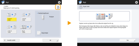 Brug af funktionen HjælpAfhængigt af den viste funktion vises  nogle gange øverst til højre på skærmbilledet. Tryk på  for at tjekke funktionens beskrivelse og betjening. Tryk på <Slut> for at vende tilbage til det forrige skærmbillede. Betjen på samme måde som med en smartphone (svirp/knib/træk og slip)På nogle skærmbilleder kan du skifte side eller rulle ved at svippe din finger op/ned eller til højre/venstre på skærmbilledet på samme måde som på en smartphone. Du kan også zoome skærmbilledet ind eller ud ved at sprede eller samle to fingre (knibe). Du kan trække det forstørrede skærmbillede med din finger. Tilpasning af skærmens udseende og handlingsbetingelserneHvis <Tillad skærmforstørrelse> er indstillet til <Til>, zoomes der ind på hele skærmen, når der udføres knibebetjening på eksempelskærmbilledet. Hvis <Tillad skærmforstørrelse> er indstillet til <Fra>, zoomes der kun ind/ud på eksempelskærmbilledet. Eksempelskærmbillede Eksempelskærmbillede | | | Hvis <Tillad skærmforstørrelse> er indstillet til <Til> | eller