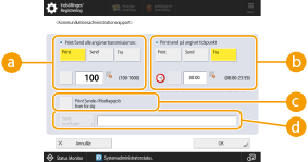 Du kan ikke konfigurere indstillingerne for kommunikationsadministrationsrapporten, når <Vis Joblog> i <Administrationsindstillinger> er indstillet til <Fra>. Hvis du ændrer <Vis Joblog> i <Administrationsindstillinger> fra <Fra> til <Til>, ændres <Print/Send alle angivne transmissionsnr.> og <Print/send på angivet tidspunkt> i kommunikationsadministrationsrapporten endvidere automatisk til <Fra>. <Vis Joblog> |