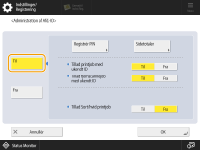 2 | Tryk på <Registrér>. ![]() Sådan redigeres indstillinger for afdelings-ID Vælg det afdelings-ID, du vil redigere, og tryk på <Redigér> for at vise skærmbilledet Redigér. Sådan slettes indstillinger for afdelings-ID Vælg det afdelings-ID, du vil slette, og tryk på <Slet> <Ja>. |